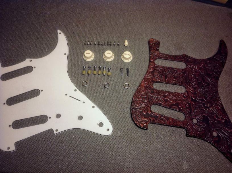 En las Stratocasters, el hecho de poner un golpeador oscuro sobre el fondo claro del cuerpo, hace que le dé un toque sofisticado a la guitarra, y aún más si los botones de los potenciómetros, el pitorrito del selector y la funda de las pastillas son de color blanco o crema. En nuestro caso, hemos usado un golpeador de piel, en color marrón, con relieves de motivos florales.