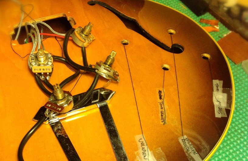 Cuando el cliente nos trae una guitarra de caja para cambiarle las pastillas y revisar el cableado y potenciómetros, así como el jack de entrada, lo primero que nos pregunta es: ¿Cómo lo vais a hacer?, si los únicos huecos visibles para acceder a la electrónica son las 2 «efes» de tipo violín de los laterales. Y no es que no tengan razón, pero casi siempre olvidan que las pastillas, una vez extraídas, también dejan «huecos» con los que poder trabajar el conexionado.