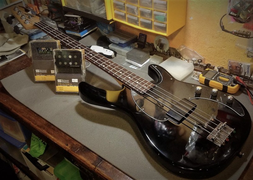 El caso que nos ocupa en este post, es el de un bajo activo PEAVEY serie FORUM made in USA de 4 cuerdas, al que la pastilla original no acababa de convencer al cliente, y la verdad es que creemos que no deja de tener algo de razón, ya que no se definen muy bien los armónicos y su sonido es algo denso e inconcreto en agudos, por lo que le hemos propuesto cambiarla por una de formato MUSICMAN, de la firma SEYMOUR DUNDAN, con Previo activo.
