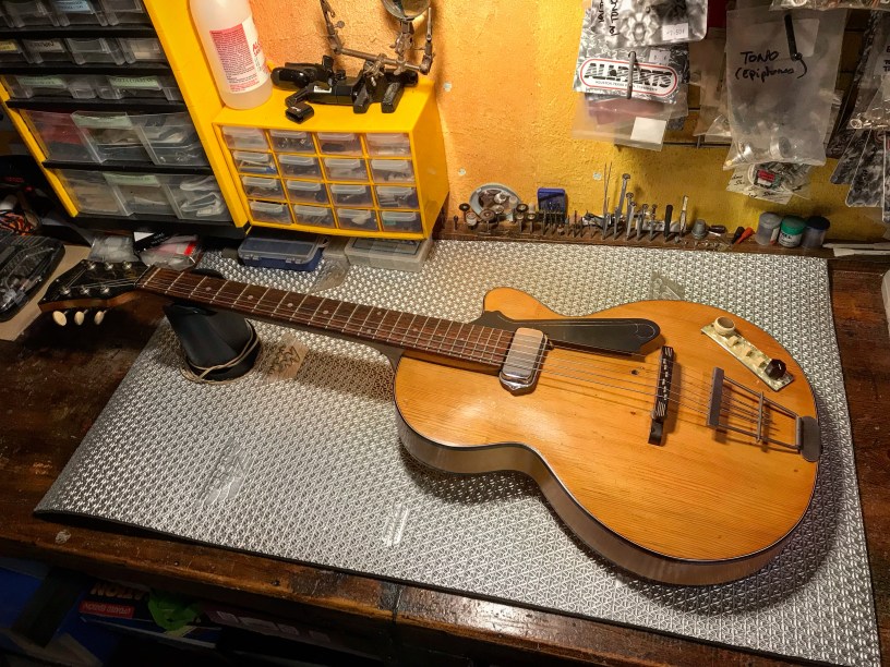 Mola mucho cuando un cliente nos viene con rarezas a las que tenemos que rescatar. En este caso, se trata de una guitarra Höfner Club 50 a la que prácticamente le falta todo. No quedará como nueva, pero para nuestro gusto, eso es mejor, ya que se verá más auténtica, debido a los años que arrastra y que hacen que sea una verdadera pieza vintage.