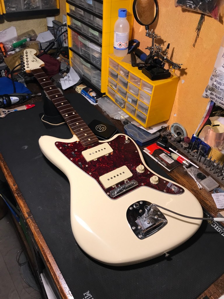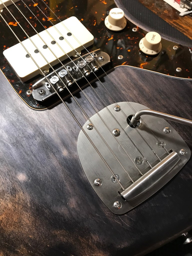 En el caso de la Jazzmaster Japonesa (La de color madera oscuro) se trata de una Tokai en la que el M2 encajó a la perfección, sin necesidad de hacer orificios nuevos. (podréis ver en otro blog cómo apantallamos esta misma guitarra, aparte de colocar el Mastery Bridge M2)
